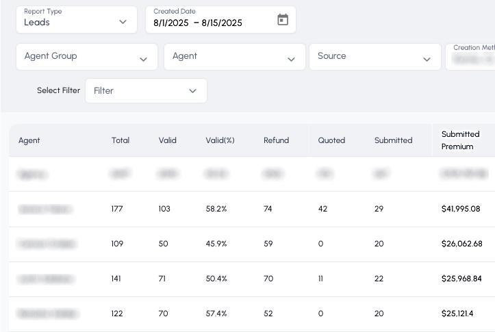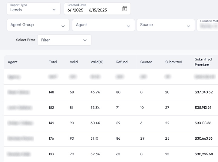What you’re seeing below is not a highlight reel. These are real submissions recorded directly inside our CRM, showing premiums written and leads worked within 15-day windows. We intentionally pulled different months at random — not peak periods — to give a clear, honest picture of what happens when the system is used correctly. No filters. No projections. Just documented activity and measurable output.